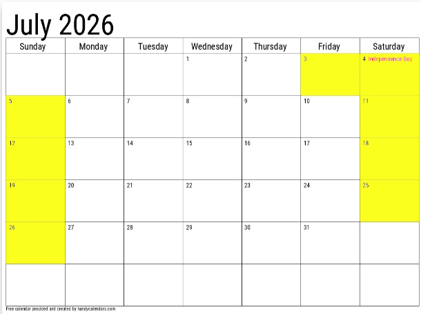 - 4th of July: Friday, Saturday, Sunday – July 3-5