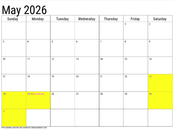 - The last two weekends in May, including Memorial Day Weekend: Saturday, Sunday, Monday – May 23-25